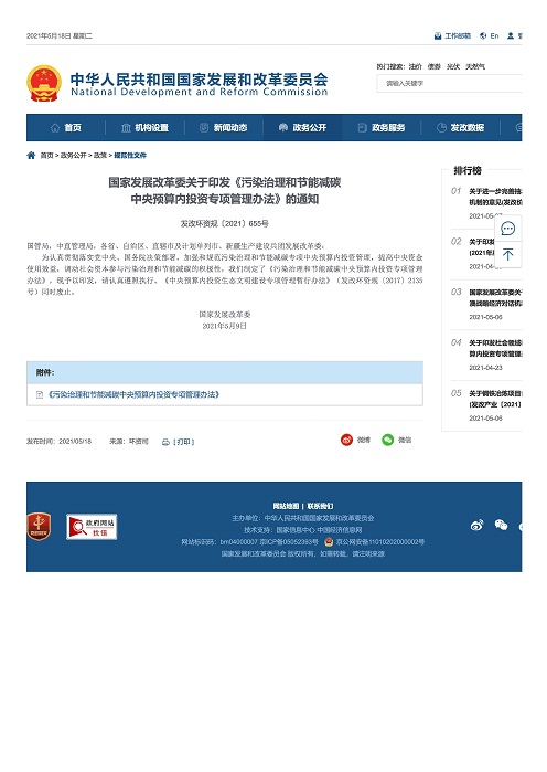 国家发展改革委关于印发《污染治理和节能减碳中央预算内投资专项管理办法》的通知发改环资规〔2021〕655号 来 …